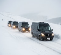 four black mercedes benz sprinter vans parked in front of snowy mountains